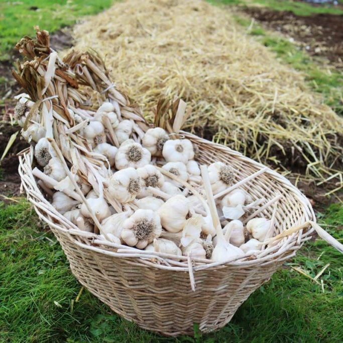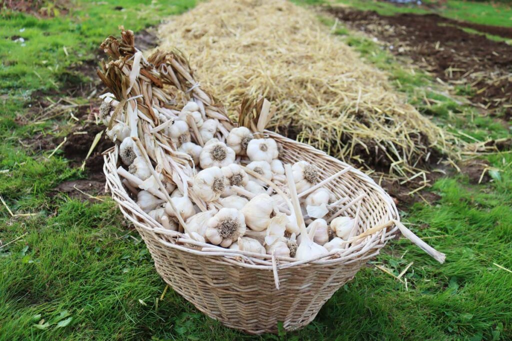 Plantings include garlic, flowers, and seasonal produce, with attention given to soil regeneration, water stewardship, and low-impact methods.